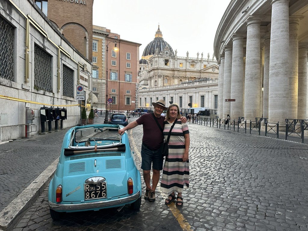 We were particularly keen on seeing St Peter’s as the basilica was closed for the Jubilee to anyone other than the Catholic pilgrims who’d descended on the city. While we couldn’t go inside, we got a great view of the outside as well as the surrounding square. And here, like everywhere we went while crammed in the back of the Fiat, Ery, took photos. By the time the tour was over, we had more than 100 photos of us with the Fiat somewhere in the picture. It was a unique experience and I’m glad we added it to our itinerary. It made our sunset and nighttime tour of Rome that much more special.